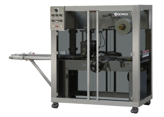 本機適用于各行業(yè)中的單件盒式物品的薄膜自動包裝(帶金拉線)。本機整體機架采用碳鋼噴塑、落地多開安全門結構,采用平推式推盒結構,更換模具簡單,調(diào)節(jié)距離多處采用手搖式調(diào)節(jié)尺寸,大大節(jié)省換模具時間,固定膜處采用氣漲軸輥固定,使換膜更簡單、快速。